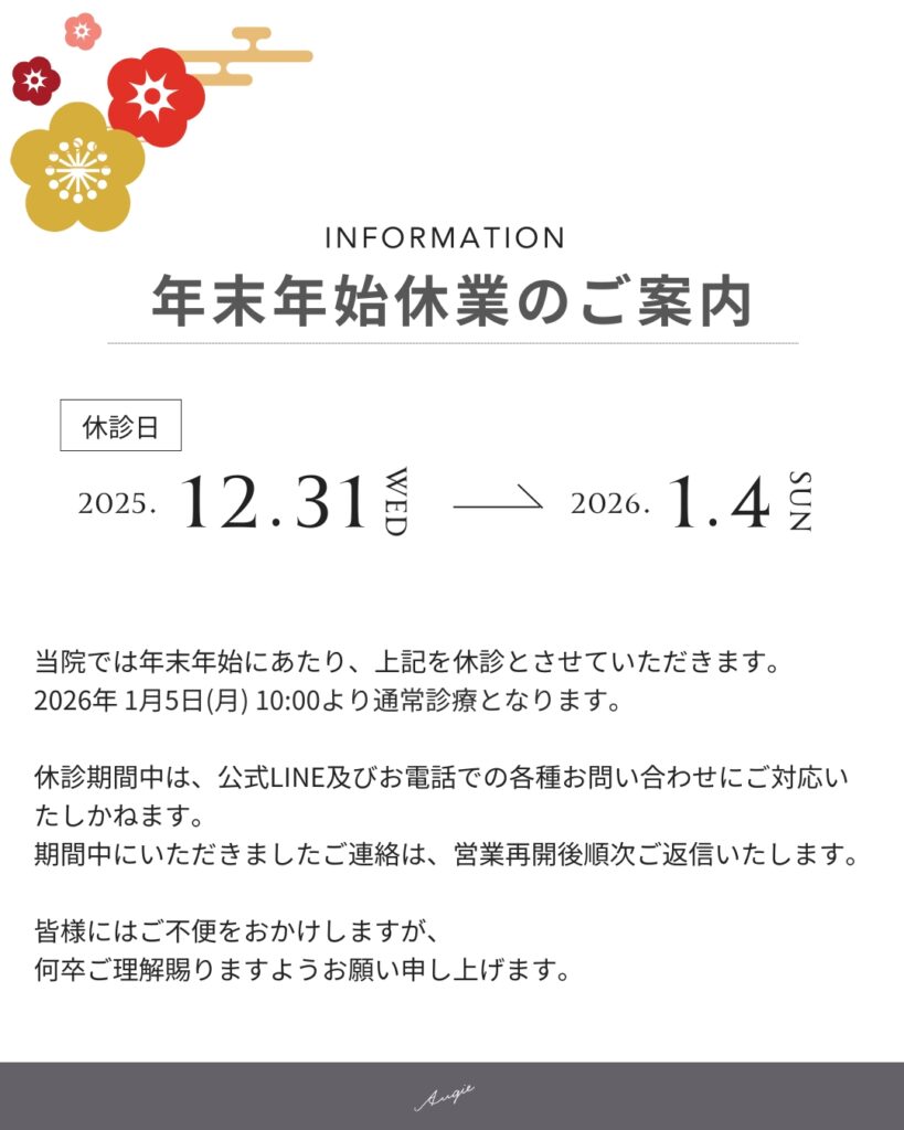 いつもANGIE (アンジークリニック)をご愛顧いただきまして誠にありがとうございます。年末年始営業に関しましてお知らせいたします。